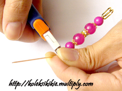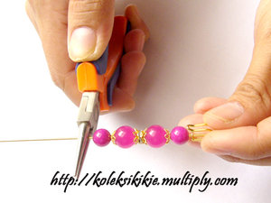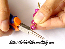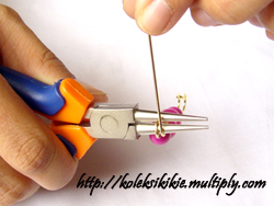 Gunakan Tang Round Nose Plier, letakkan di ujung rangkaian manik dengan diberi jarak seukuran tebal peniti. Perhatikan posisi kepala jarum peniti, arahkan ke atas seperti tampak pada gambar