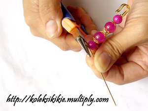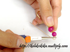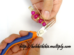 masih menggunakan tangan kiri, lanjutkan lagi membengkokkan jarum peniti mengikuti lingkar dari tang round nose plier. Lihat gambar u lebih jelasnya.