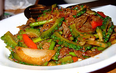 * taburi pare dengan sedikit garam dan gula pasor, remas-remas hingga layu dan berair. Bilas bersih dan tiriskan