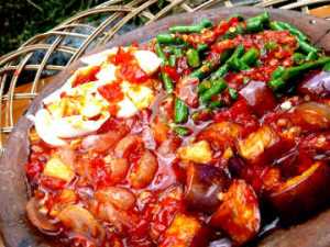 - Sajikan sambal di tengah cobek, dikelilingi oleh telur rebus, bawang, terong, dan kacang panjang.