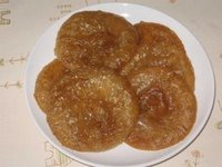 - Goreng cucur hingga matang (tusuk bagian tengah adonan dengan tusuk sate untuk memudahkan menggoyang adonan dan agar matangnya merata). Angkat dan tiriskan. Sajikan.