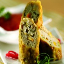 3. Ambil selembar dadar. Beri isi di salah satu sisinya. Gulung.