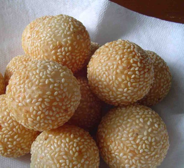 ambil adonan kulit, tipiskan, isikan kacang ijo, bulatkan kulit sampai menutup rapat. Gulingkan di wijen, goreng dengan minyak yang banyak dan api sedang.