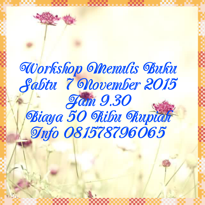 Acara workshop ini di kemas dengan acara santai, sambil makan makan, akan ada pengenalan tentang permata ilmu, dan tanya jawab tentang kepenulisan dan permata ilmu. Acara akan di selenggarakan Insya Alloh hari Sabtu 7 November 2015, jam 9.30 tepat. Investasi 50 ribu rupiah, untuk pendaftaran sebaiknya datang langsung atau transfer. Untuk bayar di tempat bisa di lakukan selama persediaan tempat masih ada. Acara workshop adalah pengantar tips dan trik menembus penerbitan selama 15 menit kemudian di lanjutkan tanya jawab.