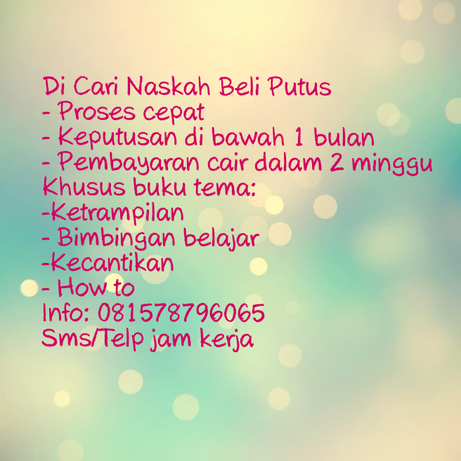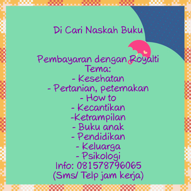 Kami tetap menerima naskah dengan pembayaran royalti. Untuk pembayaran royalti proses seleksi 4-bulan, pembayaran mulai bulan ke 7 sejak buku terbit. Info di nomor di atas. Terimakasih