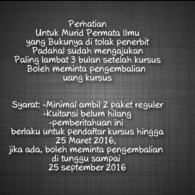 Syarat tambahan: judul di ajukan lewat permata ilmu dan sudah di setujui permata ilmu, berlaku untuk pengajuan buku pertama yang pembuatannya di lakukan pada saat kursus