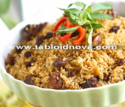 3. Masukkan nasi dan kismis, aduk rata, sajikan dengan taburan bawang goreng.