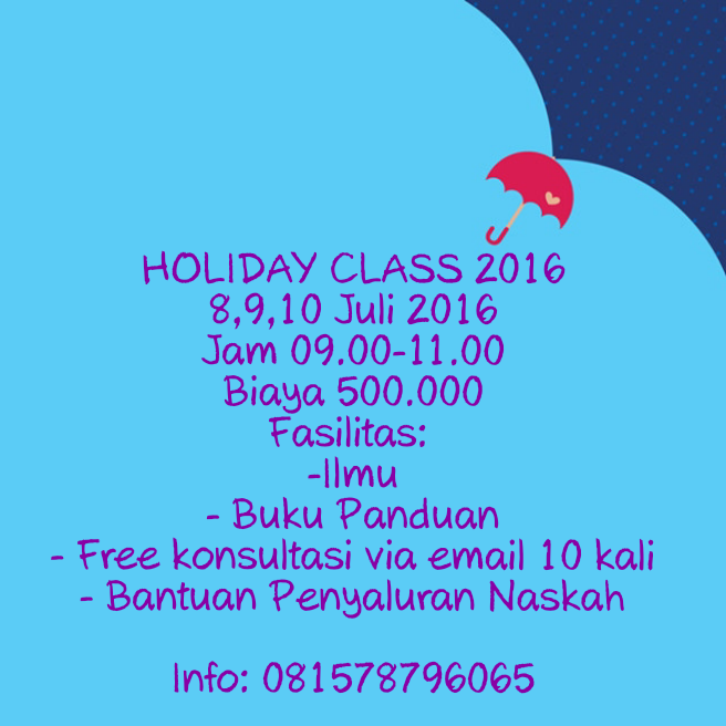 Liburan di jogja? Tidak lengkap kalau tidak tambah ilmu. Di kota pelajar lho, masak cuma jalan jalan aja. Jangan lewatkan permata ilmu buka kelas khusus liburan. Terbatas 10 orang saja, bagi teman teman yang ingin bisa menulis dan menerbitkan buku di penerbit terkemuka di Indonesia. Kelas ini terbatas 10 orang saja ya.