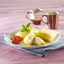 - Ambil selembar kulit dadar. Beri isi di tengah kulit. Lipat kanan dan kirinya bentuk persegi. Sajikan dingin.