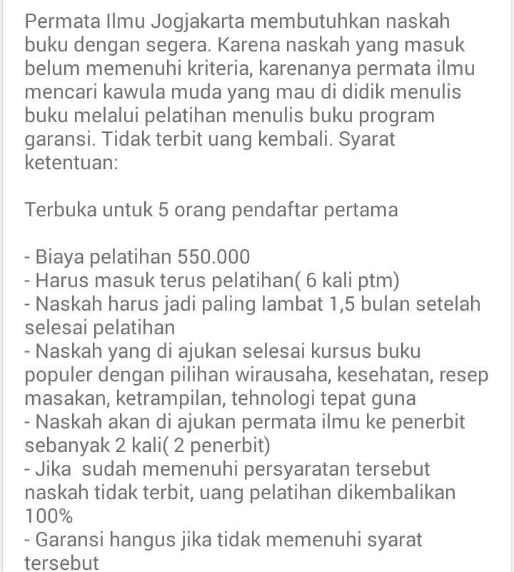 Program tersebut terbuka untuk masing masing 5 orang pendaftar pertama bulan februari dan maret 2017. Syarat tambahan: Tema naskah yang di ajukan harus di setujui pembimbing