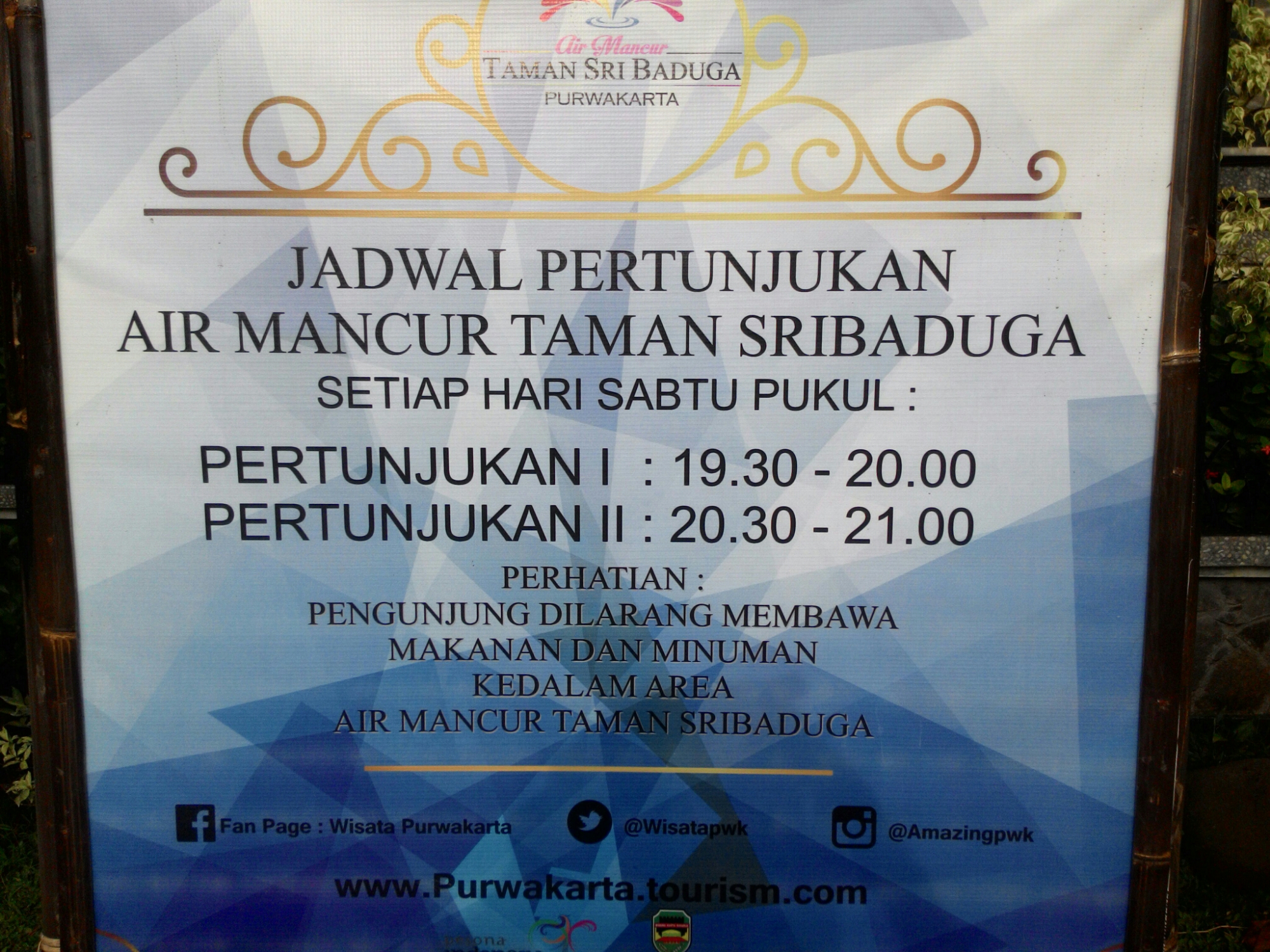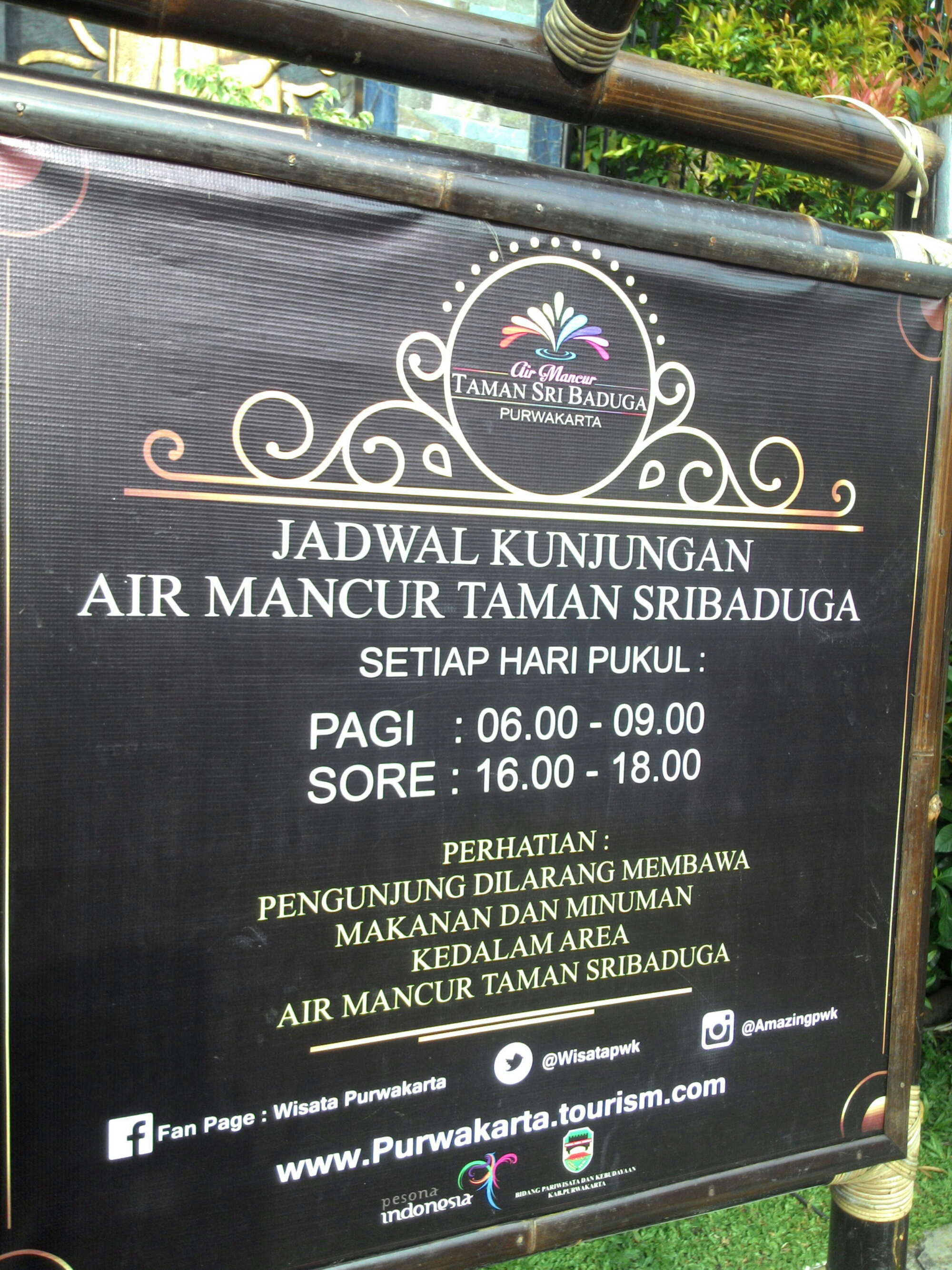 Air mancur ini terbuka untuk umum, setiap hari, namun demikian untuk pertunjukannya hanya diselenggarakan setiap malam minggu saja. Banyak jalan untuk menuju ke sana dari arah jogjakarta. Kali ini saya memilih menaiki kereta Argo Dwipangga di sambung dengan kereta Argo parahyangan, mengingat kedua jadwal kereta tersebut tidak terlalu berjarak dekat, tidak juga terlalu jauh, cukup aman dan nyaman untuk transit