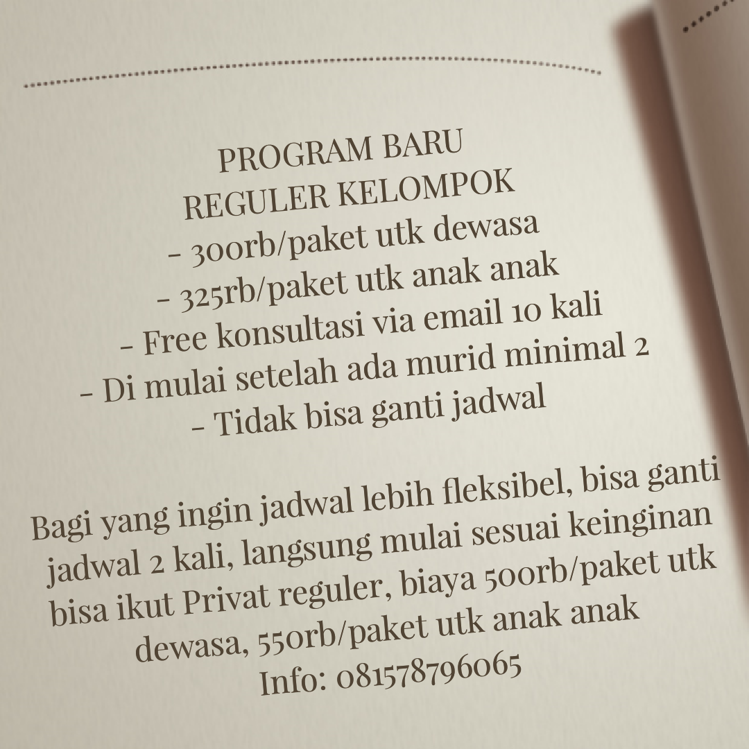 Bedanya lagi, kalau privat reguler boleh langsung dimulai begitu daftar, kalau yang reguler kelompok ini nunggu teman dulu ya, minimal 2 orang baru bisa di mulai
