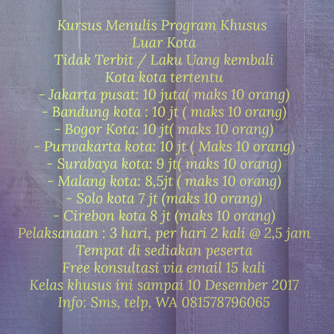 Pos ini dipublikasikan di Uncategorized dan tag KURSUS MENULIS BUKU, kursus menulis buku bandung, kursus menulis buku jakarta, malang, purwakarta, solo, surabaya. Tandai permalink.