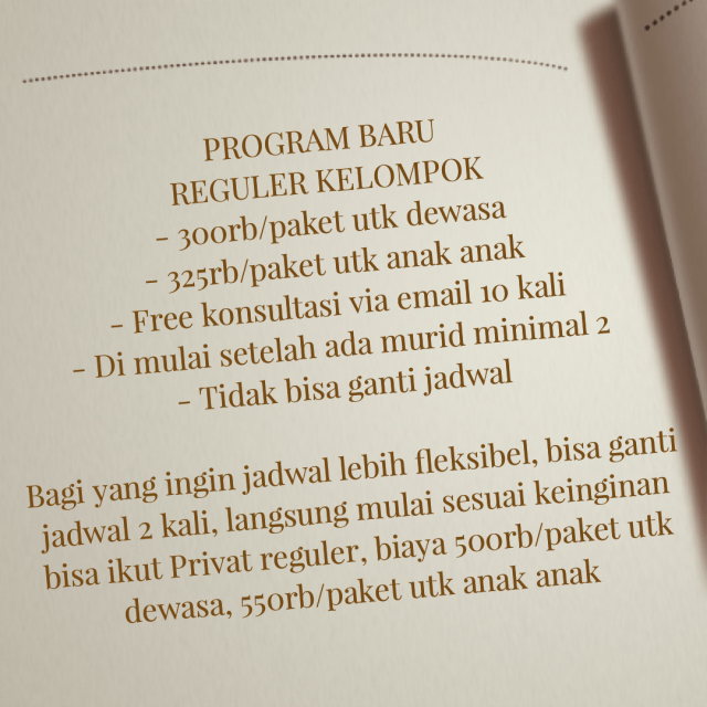 NB: Per 12 Oktober 2017. Aturan baru reguler kelompok, jika sudah menunggu 2 minggu tidak ada teman maka calon peserta bisa pilih tidak jadi ikut, DP dikembalikan 100% atau Upgrade privat reguler, mendapatkan diskon 50rb, jadi cukup bayar total 450rb, jadi tinggal bayar 450rb dikurangi DP yang telah dibayarkan