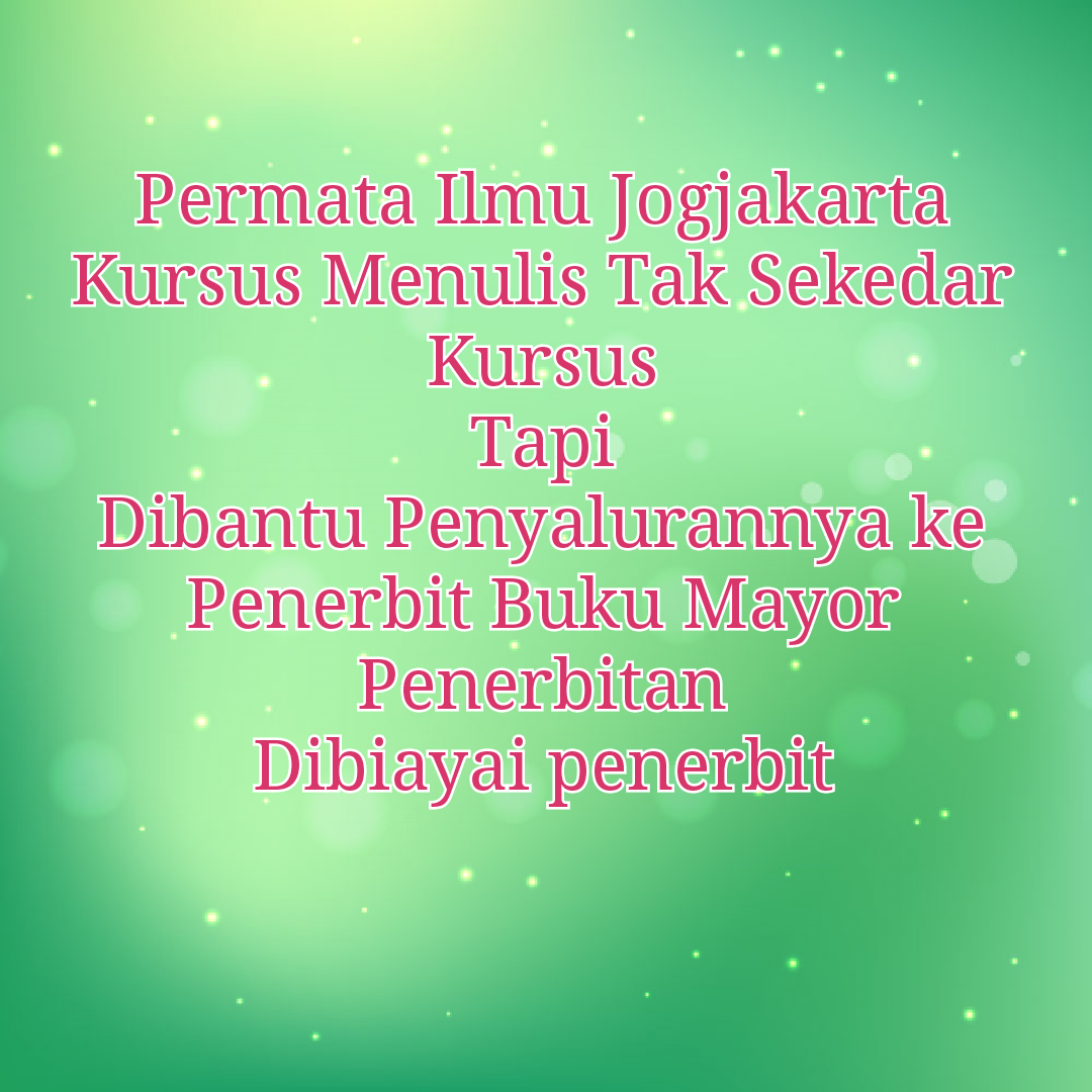 Jika anda sudah lama sekali ingin menulis, bolak balik di tolak penerbit, bingung bagaimana caranya agar buku anda di terbitkan oleh penerbit dengan biaya penerbit tapi anda juga kesulitan keuangan untuk kursus menulis, boleh anda gabung bersama permata ilmu jogjakarta. Permata ilmu jogjakarta menawarkan solusi untuk anda dengan cara yang sangat mudah. Kursus menulis buku di Permata Ilmu Jogjakarta daftar 2 gratis satu dengan syarat ambil jadwal yang sama. Jadi kuncinya, kalau anda mau kursus menulis gratis, perbanyak silaturahmi, ajakin temannya kursus menulis di permata ilmu jogjakarta. Kursus menulis buku di permata ilmu jogjakarta tak sekedar kursus menulis. Naskah anda dibantu diterbitkan ke penerbit mayor. Biaya penerbitan ditanggung penerbit