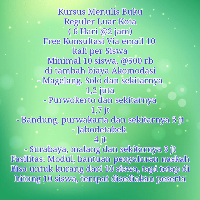 Bagi anda yang kurang puas dengan pelatihan singkat, dan ingin pelatihan reguler seperti di jogja, bisa juga mengundang permata ilmu dengan Investasi yang sangat murah, sudah bebas biaya/free bantuan penyaluran naskah