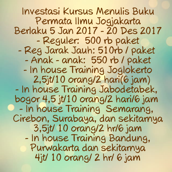 Bagi anda yang kurang puas dengan pelatihan singkat, dan ingin pelatihan reguler seperti di jogja, bisa juga mengundang permata ilmu dengan Investasi yang sangat murah, sudah bebas biaya/free bantuan penyaluran naskah