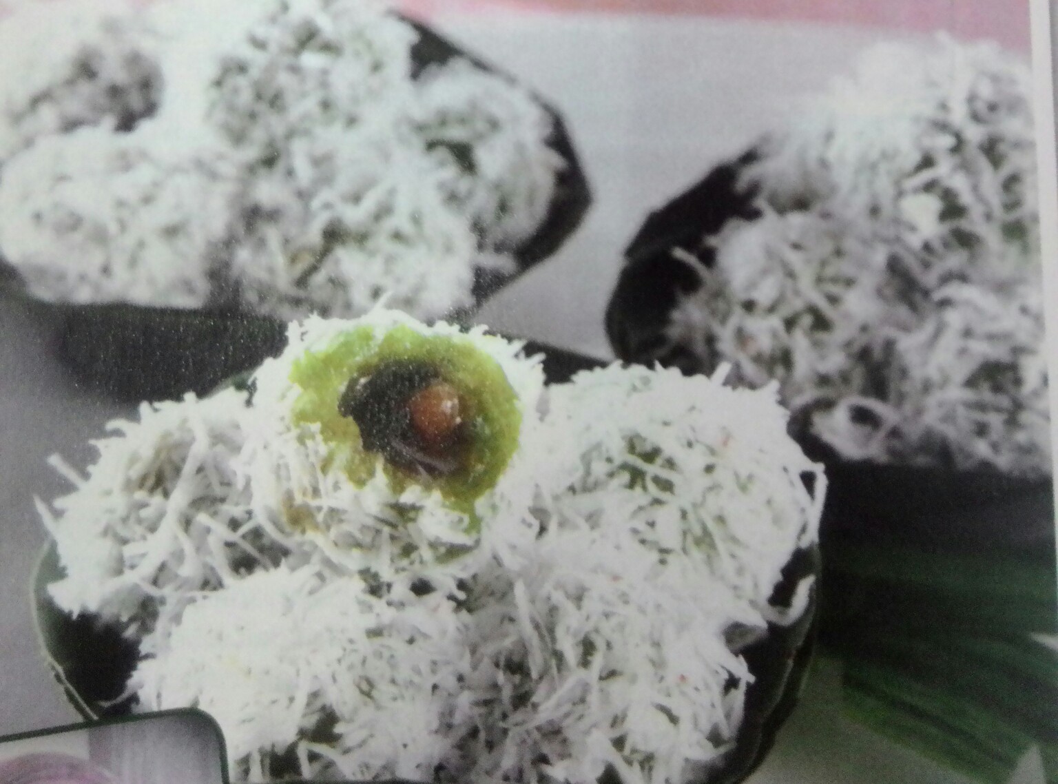 Bahan: 300 gram ubi putih, potong 4 bagian, 75 gram tepung sagu, 1/2 sendok teh garam, 75 ml air daun pandan suji dari 20 lembar daun suji dan 2 lembar daun pandan dihaluskan, 100 gram gula merah di sisir halus, 100 gram kelapa parut kasar kukus dengan 1/2 sendok teh garam