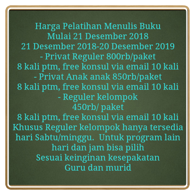 Bagi anda yang sudah bertanya tanya dan berminat kursus menulis buku di permata ilmu jogjakarta, monggo segera di eksekusi, jangan tunggu harganya naik ya. Per 21 Desember 2019 harga kursus menulis buku semua program akan naik, jadi jangan sampai menyesal yuk. Kursus menulis mana coba yang serius bantu penyaluran naskah ke penerbit? Cuma permata ilmu jogjakarta, terbukti sejak 2009