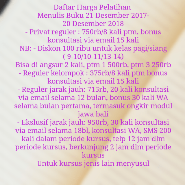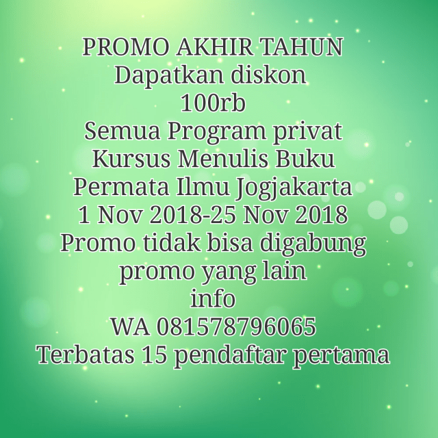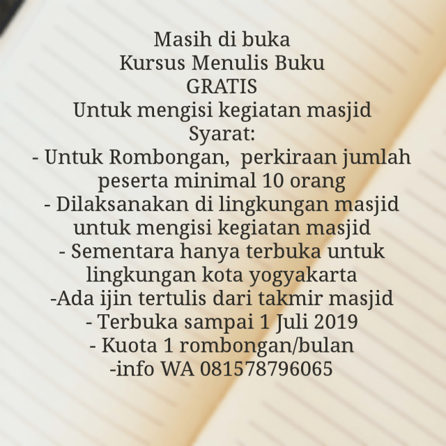 Anda pilih mana, kursus gratis atau berbayar? Kalau saya nih untuk pengenalan suka kursus gratis, tapi untuk selanjutnya akan memilih kursus berbayar. Kenapa? Sepertinya hampir tidak mungkin kursus gratis di laksanakan dengan kualitas setara dengan kursus berbayar kecuali sekali tempo saja. Sebagai contoh permata ilmu jogjakarta kadang kadang menampilkan kursus menulis buku gratis sebagai promosi, tentu saja isinya tidak se detail kursus berbayar namun ada waktu juga permata ilmu jogjakarta mengadakan kursus gratis dengan kualitas yang cukup baik, mungkin tidak setara juga tapi mendekati kualitas kursus berbayar saat penyelenggaraan kursus menulis buku gratis khusus untuk remaja masjid karena kursus ini adalah penyeimbang hidup bagi owner, hidup untuk beribadah kepada Alloh subhanahu wata’ala, jadi dengan kursus menulis buku gratis untuk remaja masjid ini adalah ibadah kepada Alloh sebagaimana Alloh perintahkan sadaqah. Bagi anda aktivis masjid, kesempatan bagus bagi anda silahkan di tanyakan prosesnya ke permata ilmu di wa081578796065