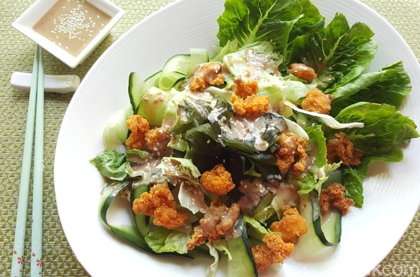 Sedang diet? Salad dengan rumput laut dengan saus wijen ini cocok jadi pilihan. Taburan ayam pok-pok yang gurih jadi protein santapan gurih segar ini.