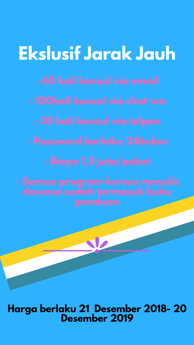 Untuk meningkatkan kualitas kursus menulis jarak jauh konsultasi via wa dan telpon yang dulunya hanya untuk kelas jarak jauh ekslusif kini kami buka juga untuk reguler jarak jauh. Berikut panduan kelas reguler jarak jauh, untuk kelas ekslusif akan kami berikan secara ekslusif untuk kelas ekslusif jarak jauh