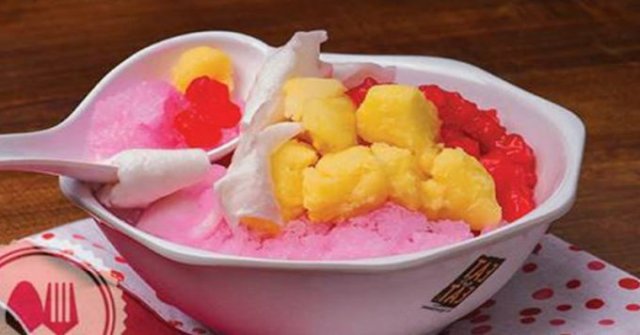 2. Tambahkan es serut, lalu tuang sirop merah dan susu kental manis. Sajikan