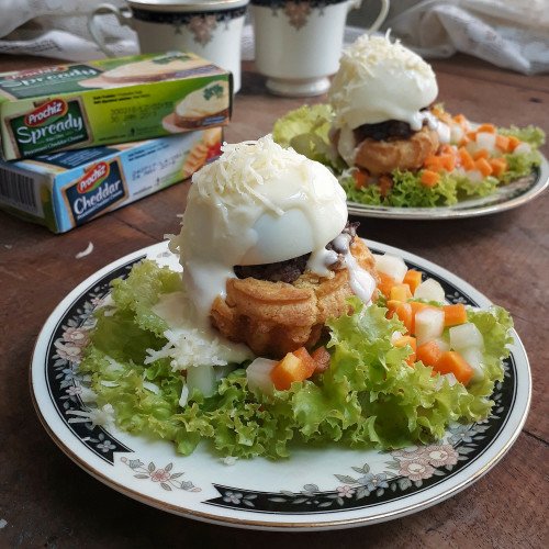 - Penyajian : Belah telur rebus menjadi 2 bagian. Lepaskan daun selada dari bonggolnya lalu cuci bersih. Gunting bagian atas kue sus lalu sendokkan bahan isi ( daging) di dalamnya. Letakkan daun selada di tempat saji. Letakkan kue sus diatasnya lalu telur rebus. Siramkan saus diatasnya lalu taburkan parutan Prochiz cheddar parut. Sendokkan acar di samping kue sus. Siap disajikan.