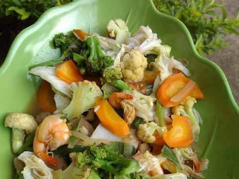 Besarkan api dan masukan 100 gram daun kol, daun bawang, 150 gram wortel yang telah dipotong-potong, 150 gram kembang kol yang diiris tipis, dan 50 gram kapri. Aduk kembali hingga layu