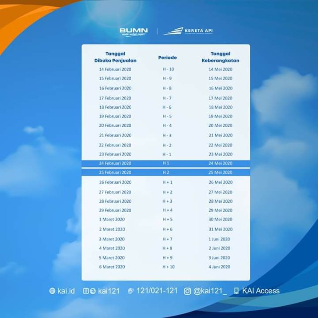 Mulai 14 Februari 2020, pemesanan tiket kereta api sudah dapat dilakukan H-90 sebelum keberangkatan, sekaligus tiket lebaran juga mulai bisa dipesan di tanggal tersebut. Yuk, cek di tabel tanggal pemesanan biar nggak salah reservasi.