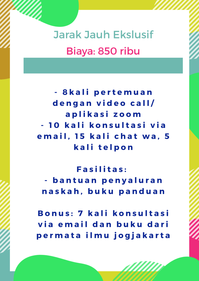 New program ya teman teman. Program ini tersaji spesial untuk anda yang tidak bisa kursus menulis buku dengan datang langsung ke jogja namun ingin mendapatkan kursus seperti yang di jogja. Pada kursus menulis jarak jauh ekslusif ini ada pertemuan kelas nya yang dilaksanakan dengan video call atau aplikasi zoom( boleh pilih)