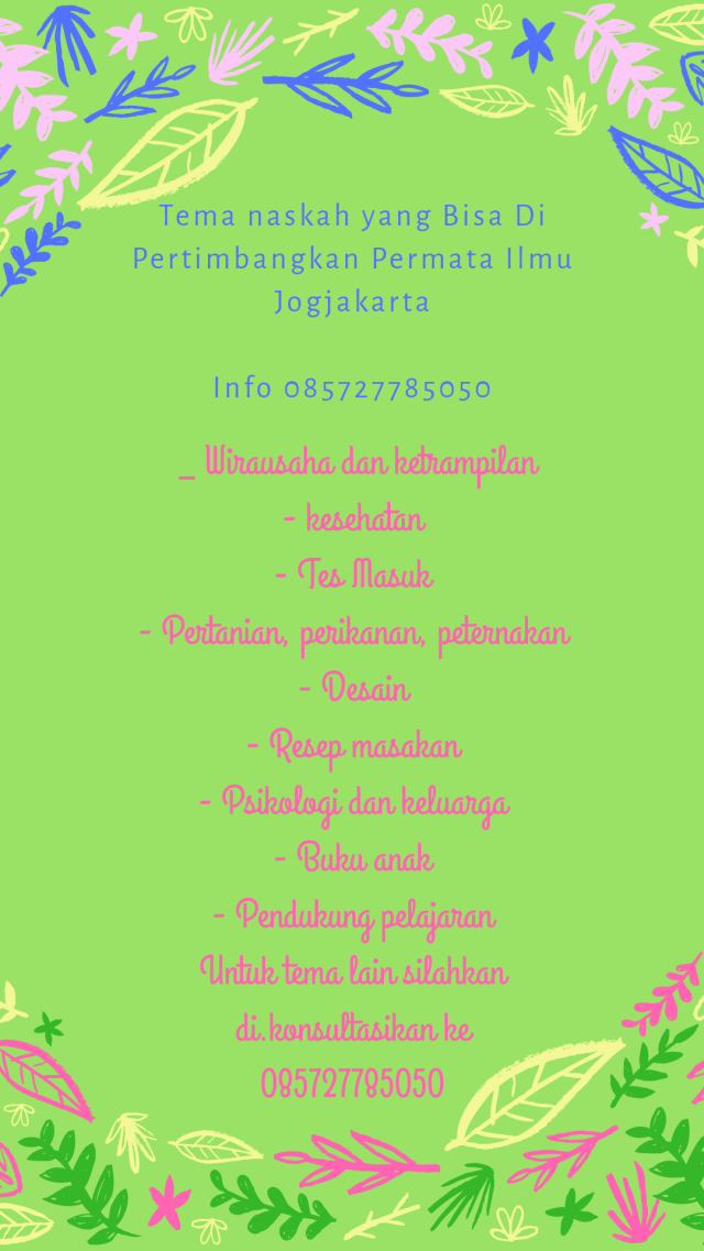 Permata Ilmu Jogjakarta menyalurkan naskah terbaik anda dengan no ribet, di bantu reparasi naskah anda dengan free sehingga naskah anda layak terbit. Kami membuka dua jalur yakni dengan seleksi naskah dan dengan kursus terlebih dahulu. Kursus tidak wajib. Jika anda sudah bisa menulis buku maka anda tidak perlu kursus dahulu