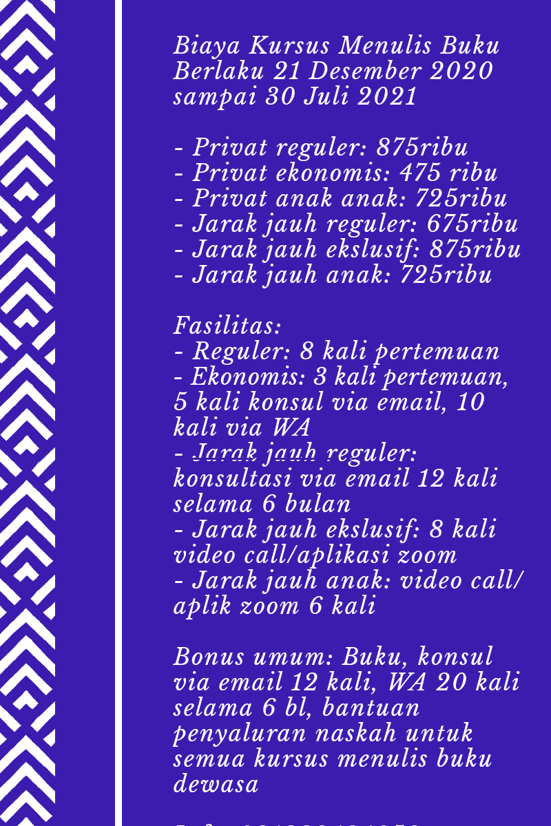 Permata Ilmu Jogjakarta mengemas kursus menulis buku dengan sangat simpel. Biaya pas, tidak terlalu mahal, tidak terlalu murah juga. Kami ingin antara kami dan murid murid ada simbiosis mutualisme. Apa yang murid kami bayarkan akan mendapat hal yang sesuai diinginkan, bahkan melebihi ekspektasi peserta kursus