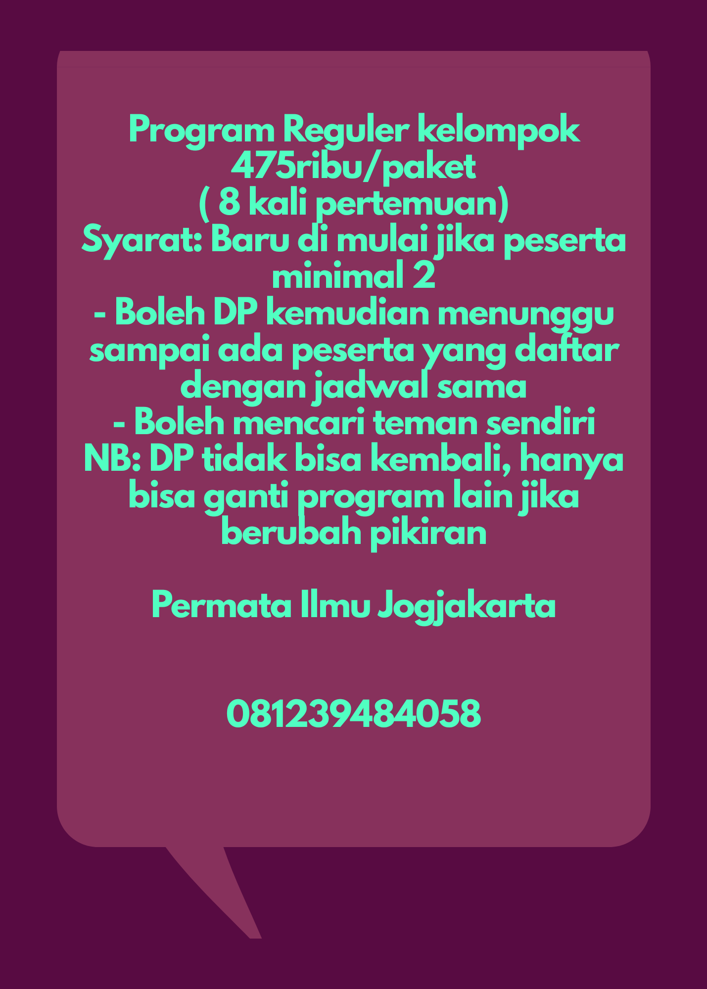 Anda tidak usah khawatir, kursus yang kami berikan tidak berbeda dengan privat reguler yang berharga 875ribu per paket. Hanya saja, untuk kursus menulis buku reguler ini hanya bisa dimulai setelah peserta minimal 2 orang ya. Kalau anda ingin cepat memulai, anda bisa mencari teman sendiri, namun jika tidak membawa teman sendiri, anda boleh menunggu dulu hingga mendapatkan teman dengan jadwal yang sama