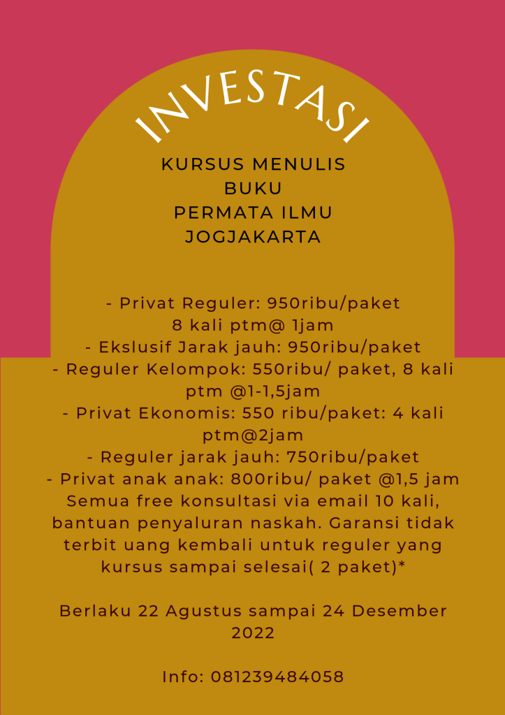 Belum bisa menulis atau takut memulai? Jangan ragu, percayakan saja ke Permata Ilmu Jogjakarta. Paket lengkap pokoknya. Di sini kursus menulis ada, bantuan menerbitkan buku ada, jasa editing, layout, desain cover juga ada. Semua harganya terjangkau di kelola dengan jujur dan profesional. Yuk mari bergabung bersama Permata Ilmu Jogjakarta