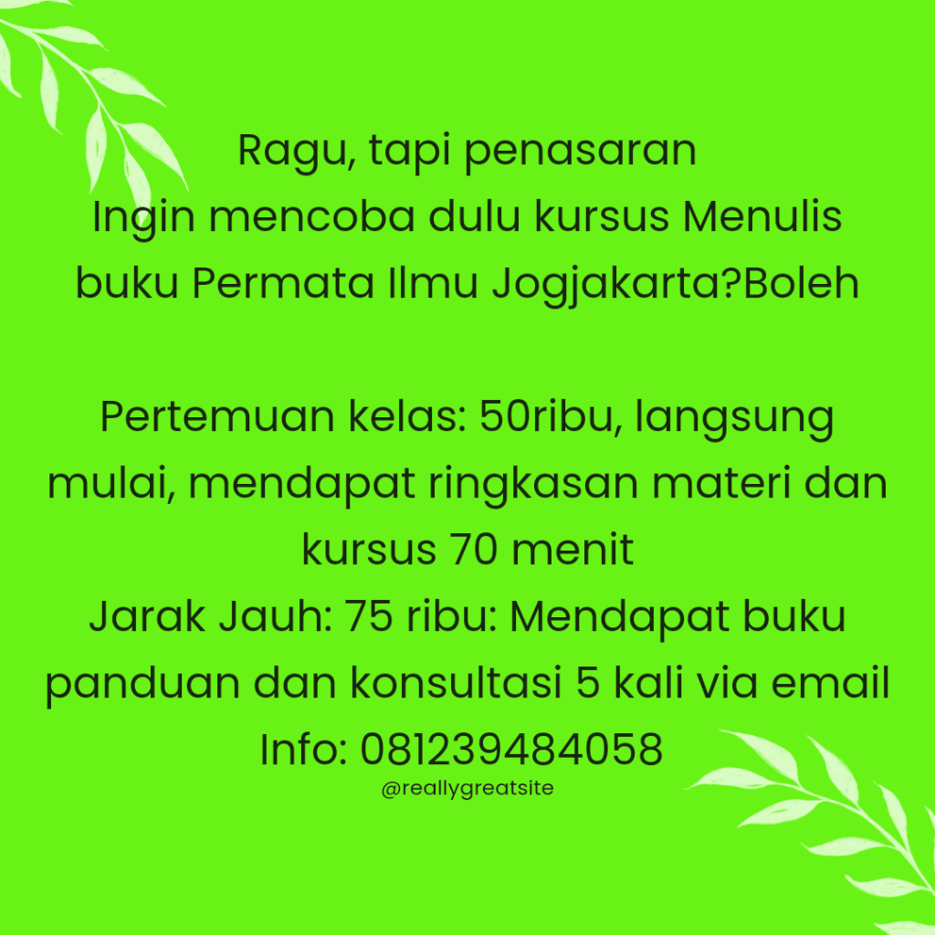 Kelas ini sekedar kelas percobaan, sekedar untuk menjawab kebutuhan calon siswa yang akan belajar menulis buku di permata ilmu jogjakarta. Mungkin masih ragu tapi penasaran ingin ikut. Jadi maaf, kami tidak bisa menjanjikan seberapa besar prosentase keberhasilannya. Jika ingin berhasil kami menyarankan mengambil paket yang minimal 8 kali ptm ( Reguler), akan lebih baik mengambil 2 paket.