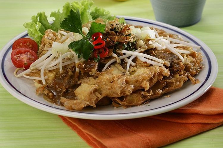 Bahan: 2 buah tahu putih 8 butir telur ayam 1/2 sendok teh garam 1/4 sendok teh merica bubuk minyak untuk menggoreng Bahan saus: 12 siung bawang putih, goreng sebentar 6 buah cabai rawit merah, goreng sebentar 8 buah cabai merah keriting, 100 gram kacang tanah, goreng 2 sendok makan petis udang 2 sendok teh garam 2 sendok makan gula merah 125 ml kecap manis 150 ml air
