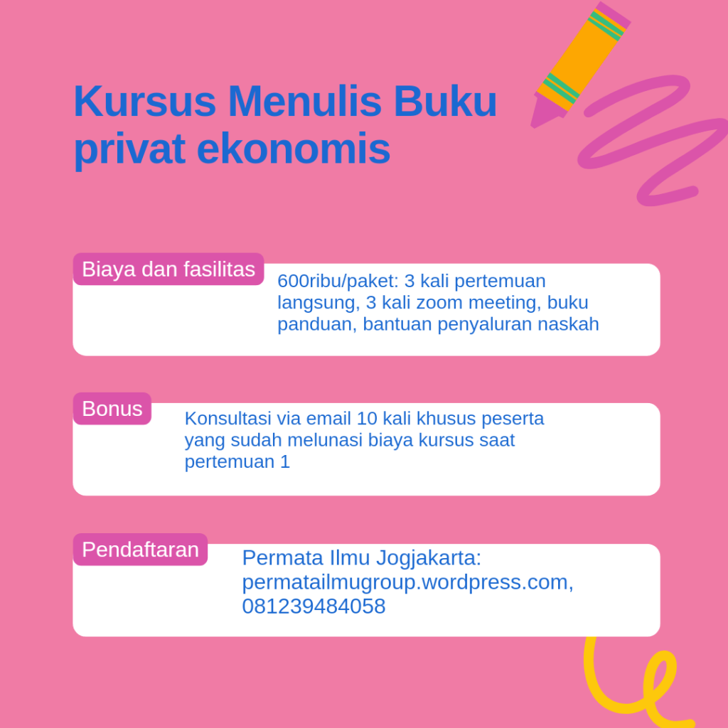Standard kursus menulis buku di Permata Ilmu Jogjakarta yang minimal anda ikuti sebenarnya adalah mengambil jenis kursus privat reguler sebanyak 2 paket, paket pertama adalah privat reguler teori sedang paket kedua adalah privat reguler praktek. Namun demikian jika anda ingin lebih hemat bisa saja mengambil reguler ekonomis ini. Hal yang kami sampaikan sama, akan tetapi penyampaiannya kami percepat