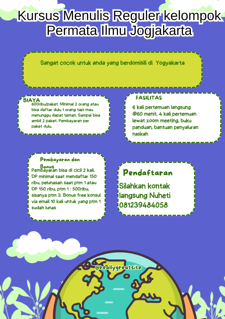 Kursus menulis buku reguler kelompok merupakan program kami yang biayanya sangat terjangkau. Meski murah, kursus ini tidak abal abal, kenapa bisa murah? Karena dilakukan minimal 2 orang, jadi biayanya di tanggung bersama, per orang 600 ribu rupiah saja, anda sudah bisa kursus menulis buku berkualitas, biaya terjangkau dan mendapat bantuan penyaluran naskah ke penerbit mayor