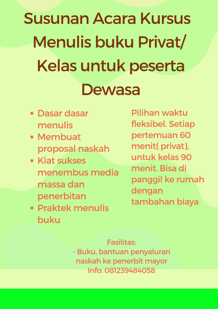Berikut susunan acara kursus menulis buku Permata Ilmu Jogjakarta untuk offline baik privat maupun kelas, jika belum jelas bisa ditanyakan lewat WA di 081239484058