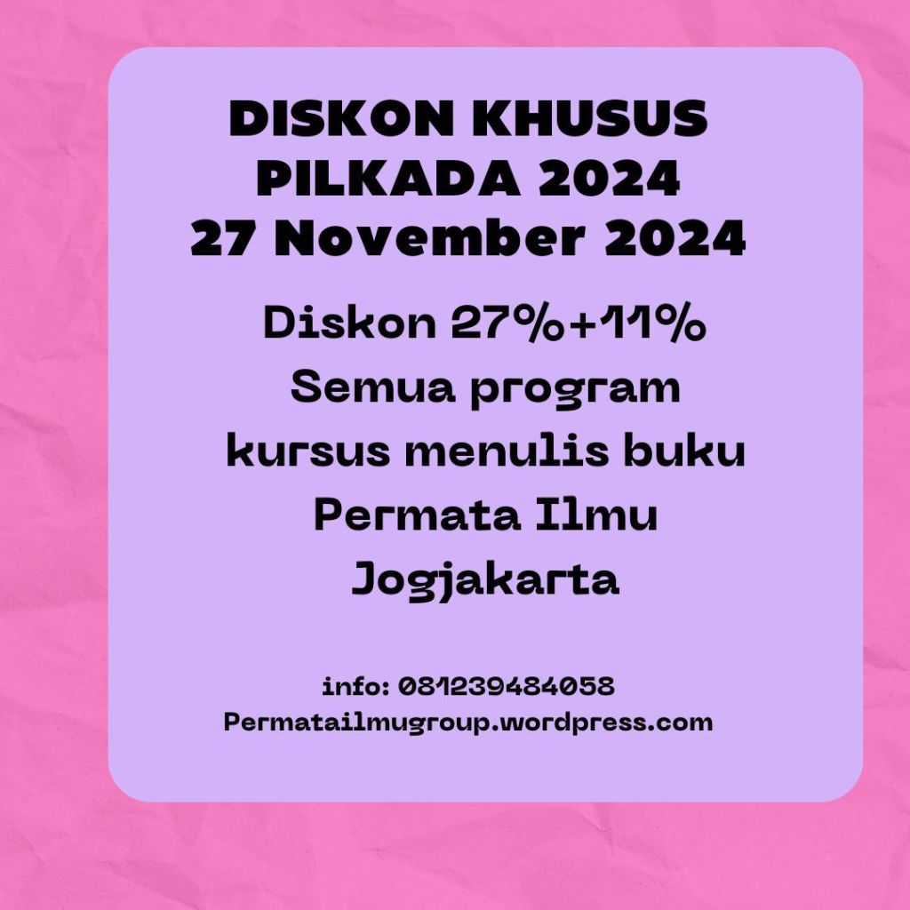 Spesial price ini khusus menyambut pilkada 2024, bagi anda yang kursus menulis buku di Permata Ilmu Jogjakarta mendapatkan diskon khusus 27+11% semua program kursus menulis buku Permata Ilmu Jogjakarta