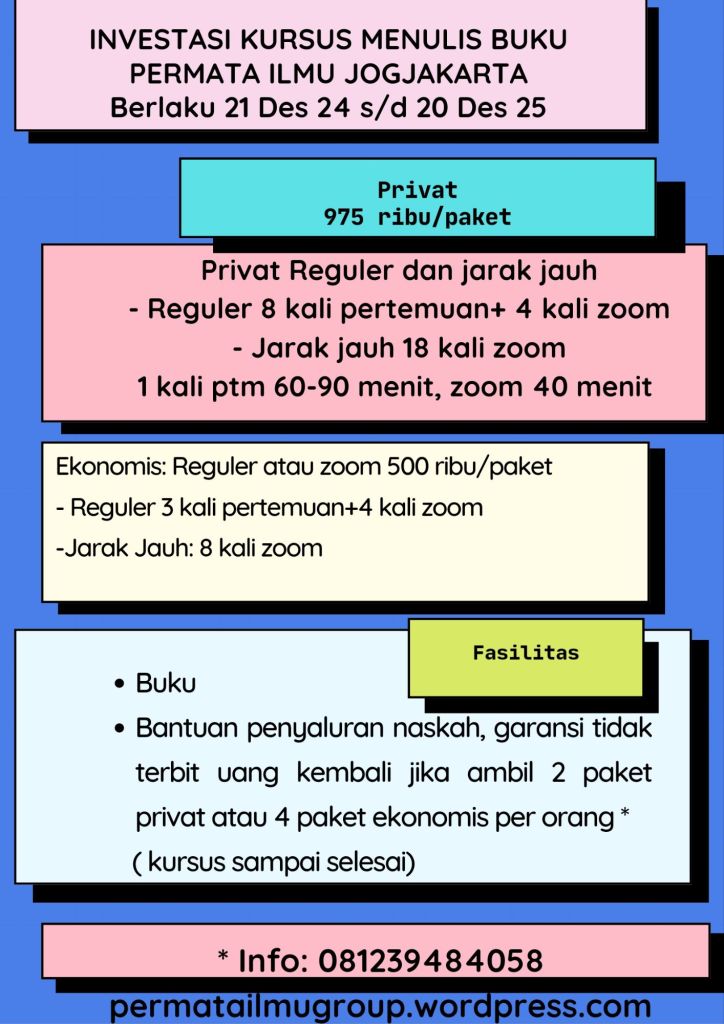 Untuk tahun ini, kami tidak menaikkan biaya kursus menulis buku, hanya saja untuk bonus konsultasi via email kami kurangi, namun untuk privat reguler kami memberikan penambahan jumlah pertemuan menjadi 8 kali.