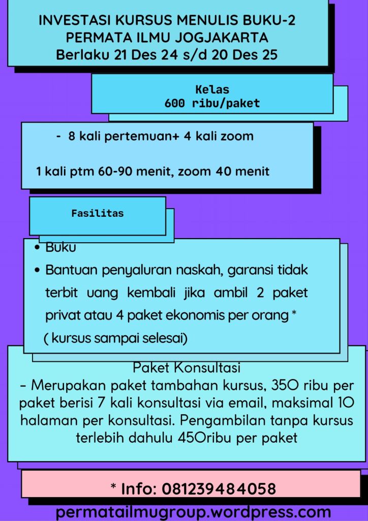 Bonus konsultasi via email tidak kami hilangkan penuh, hanya kami kurangi. Jumlah bonus tersebut disesuaikan cara pembayaran anda, jika anda membayar lunas di muka bonus lebih banyak sedang jika di cicil bonus sedikit bahkan ada yang tidak mendapat bonus konsultasi via email. Untuk kursus menulis buku in house training dan kursus menulis buku untuk anak kami tidak melakukan perubahan. Yuk mari, siaa yang ingin bukunya segera terbit jangan ragu, bergabung saja bersama Permata Ilmu Jogjakarta