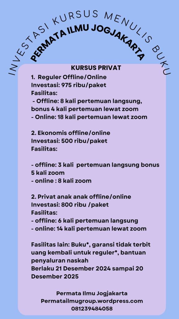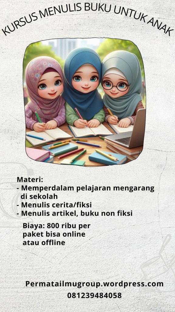 Oleh karena banyaknya keperluan tersebut, ada baiknya ayah dan bunda memperhatikan kemampuan menulis anak dengan baik, salah satunya mengajak mereka kursus menulis di Permata Ilmu Jogjakarta, tak hanya untuk keperluan sekolah, kursus menulis di tempat kami juga bisa menyalurkan hobi anak menulis cerita, cerpen, hingga buku baik fiksi maupun non fiksi. Mari bergabung bersama kami Permata ilmu Jogjakarta