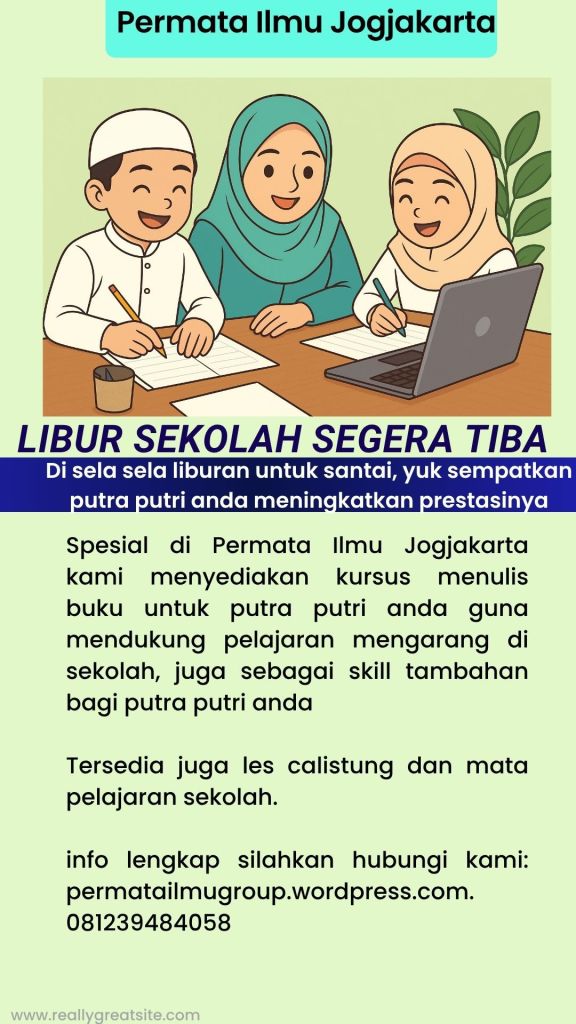Mari, bekali kemampuan dasar menulis untuk putra putri anda. Kami juga membuka kursus calistung dan mata pelajaran untuk anak. Biaya mulai 50 ribu per pertemuan minimal 10 kali pertemuan ( khusus juni-juli) sedang non promo lewat bulan juli 2025 minimal 18 kali pertemuan. Biaya kursus menulis buku 800 ribu rupiah untuk 6 kali pertemuan atau 14 kali zoom