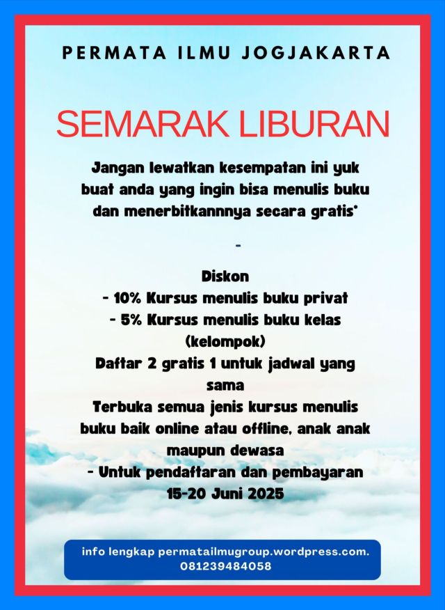 Yuk, siapa yang mau kompakan bareng keluarga kursus menulis buku di Permata Ilmu Jogjakarta, dapatkan diskon besar ya 35% di musim liburan ini.