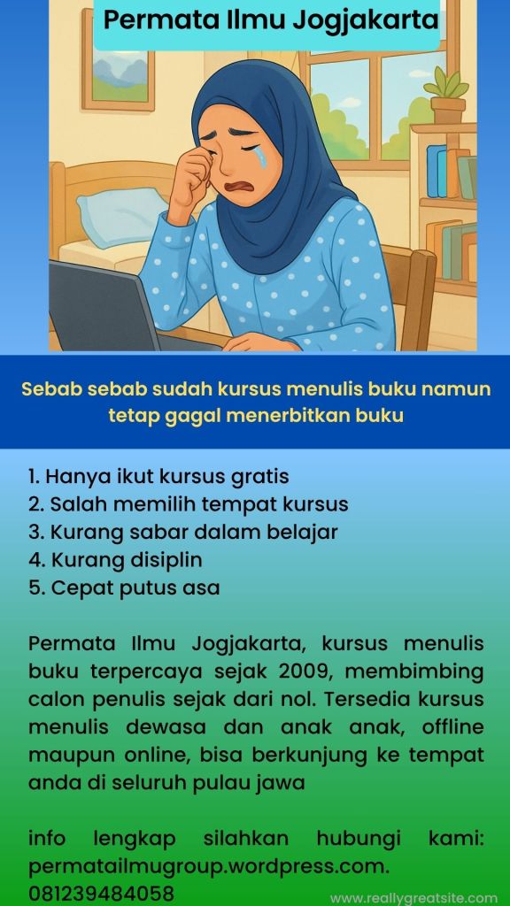 3. Kurang sabar: sudah benar ikut kursus di tempat yang baik, namun kurang sabar, ingin cepat selesai dalam waktu singkat, karena itu memilih jadwal yang sangat padat misal sehari 8 jam. Kalau di Permata Ilmu Jogjakarta memang boleh, tapi saya tidak menyarankan, saya menyarankan kursus menulis itu 1 minggu maksimal 4 jam, itu saja di bagi menjadi beberapa kali pertemuan