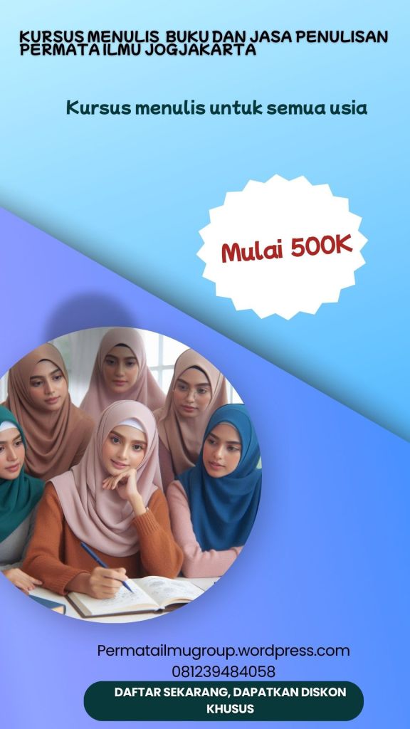 Anda ingin menghasilkan buku berkualitas untuk di terbitkan di penerbit buku mayor? Atau anda memiliki keinginan menulis buku namun tidak sempat menulisnya? Percayakan semuanya kepada Permata Ilmu Jogjakarta. Permata Ilmu Jogjakarta merupakan lembaga kursus menulis buku dan jasa penulisan terpercaya sejak 2009. Kami selalu amanah dalam bekerjasama dan selalu membina kerjasama saling menguntungkan. Kelebihan kami dalam menyelenggarakan kursus menulis buku, naskah yang anda buat selama pelatihan akan kami bantu penerbitannya lewat penerbit mayor secara gratis, anda hanya membayar biaya administrasi 50 ribu rupiah saja setelah naskah anda berhasil kami terbitkan. Informasi lengkap silahkan hubungi kami di 081239484058