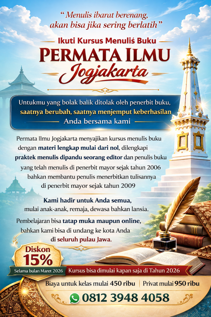 Sayangnya, menerbitkan buku di penerbit mayor dirasakan banyak orang tidak mudah. Berbagai penolakan muncul karena kuota terbatas. Permata Ilmu Jogjakarta mencoba mengatasi kesulitan itu. Bersama kami, anda tidak hanya belajar menulis namun menerbitkan karya. Yuk, libas kegagalan kamu dan gantikan dengan keberhasilan bersama Permata Ilmu Jogjakarta