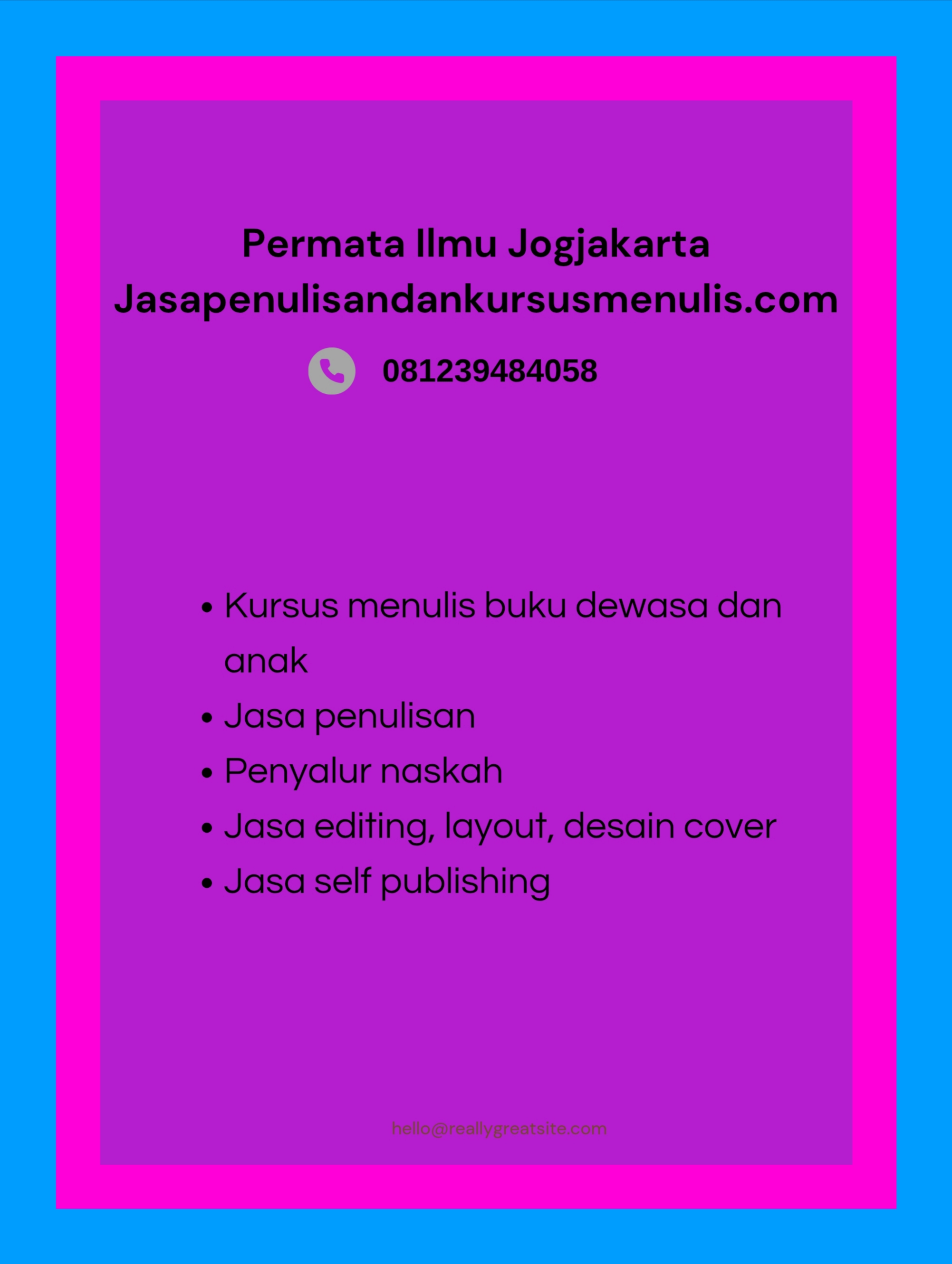 Permata Ilmu menerima jasa penulisan, editing, layout, desain cover, self publishing. Berikut tema naskah yang bisa di pesan di tempat kami. Jika anda membutuhkan bantuan menulis dengan jenis yang belum tercantum di sini bisa menghubungi kami di 081239484058.